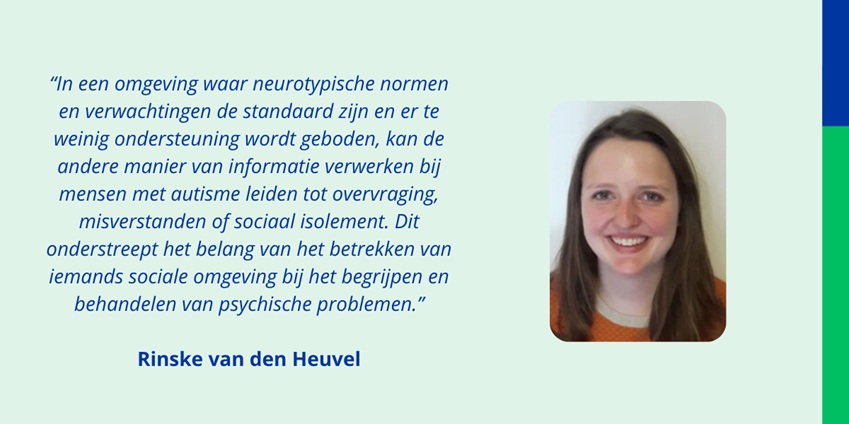 In een omgeving waar neurotypische normen en verwachtingen de standaard zijn en er te weinig ondersteuning wordt geboden, kan de andere manier van informatie verwerken bij autisme leiden tot overvraging, misverstanden of sociaal isolement. Dit onderstreept het belang van het betrekken van iemands sociale omgeving bij het begrijpen, behandelen en ondersteunen van mensen met autisme die moeite hebben om mee te komen in de verwachtingen van de neurotypische wereld. Daarom onderzoekt Rinske de sociale netwerken van volwassenen met autisme en hoe deze ingezet kunnen worden in de ggz.